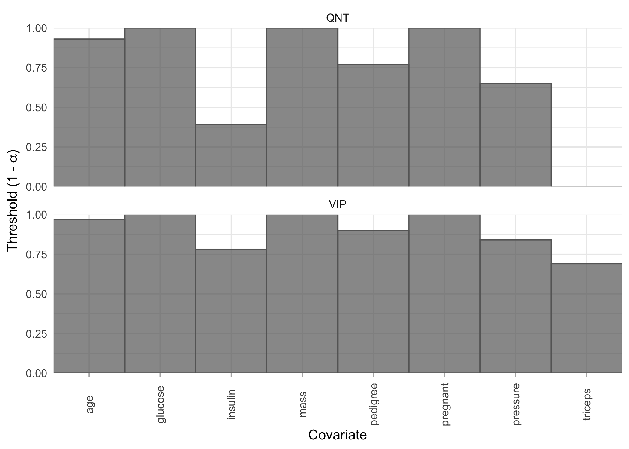 #> [1] "pregnant" "glucose" "mass"Note that the number of selected variables with QNT will always be