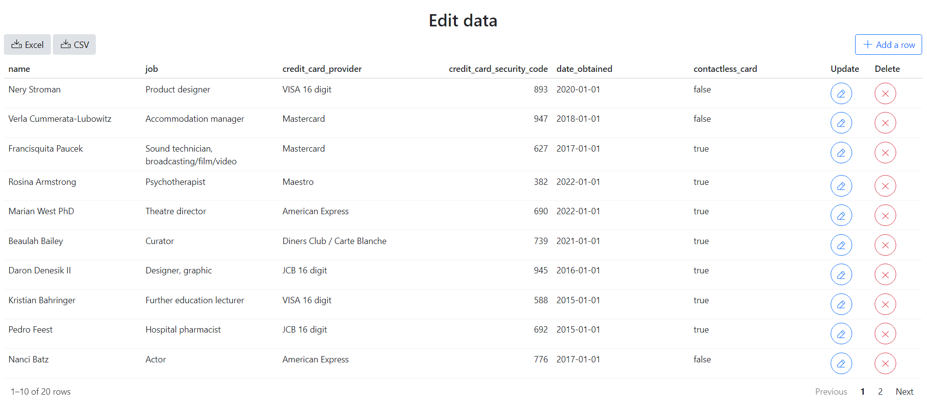 This module makes a data.frame editable, allowing the user to add, modify or delete rows.