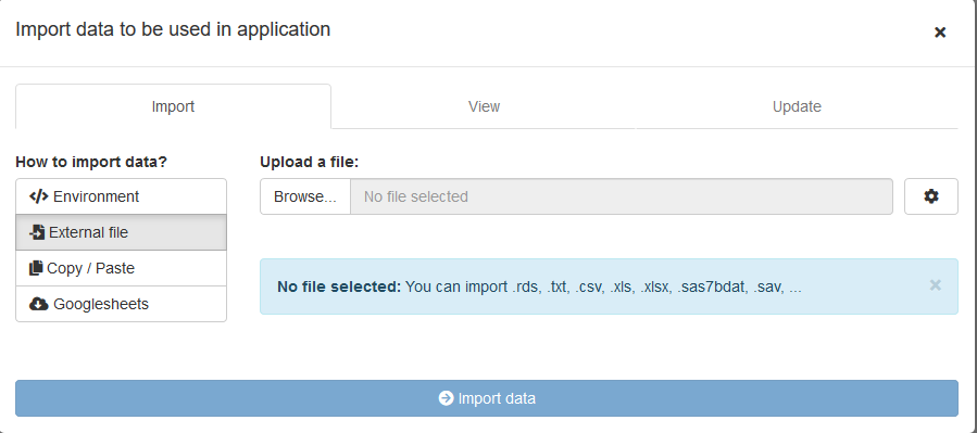 This package provides custom shiny modules to import data from various sources, select, rename and convert variables in a dataset and validate content with validate package.