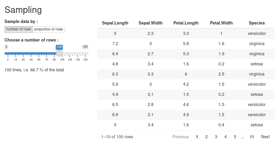 This module extracts a sample from a data.frame, based either on a fixed number of rows or on a percentage of total rows.