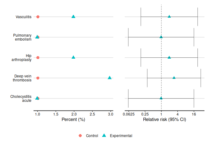 #> 4 Vascular disorders Deep vein thrombosis 2.94 (0.301, 28.8)