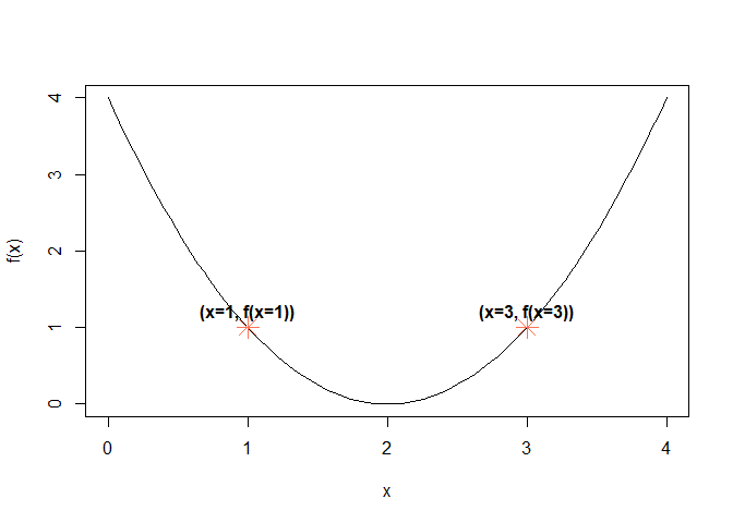 text(c(1, 3), c(f(1), f(3)), labels = c("(x=1, f(x=1))", "(x=3, f(x=3))"), pos = 3, font = 2)