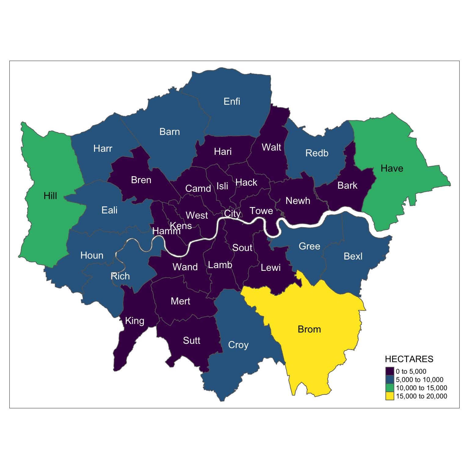 tm_polygons("HECTARES", palette = "viridis") +