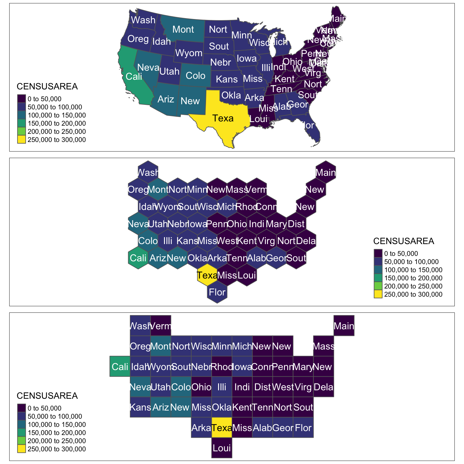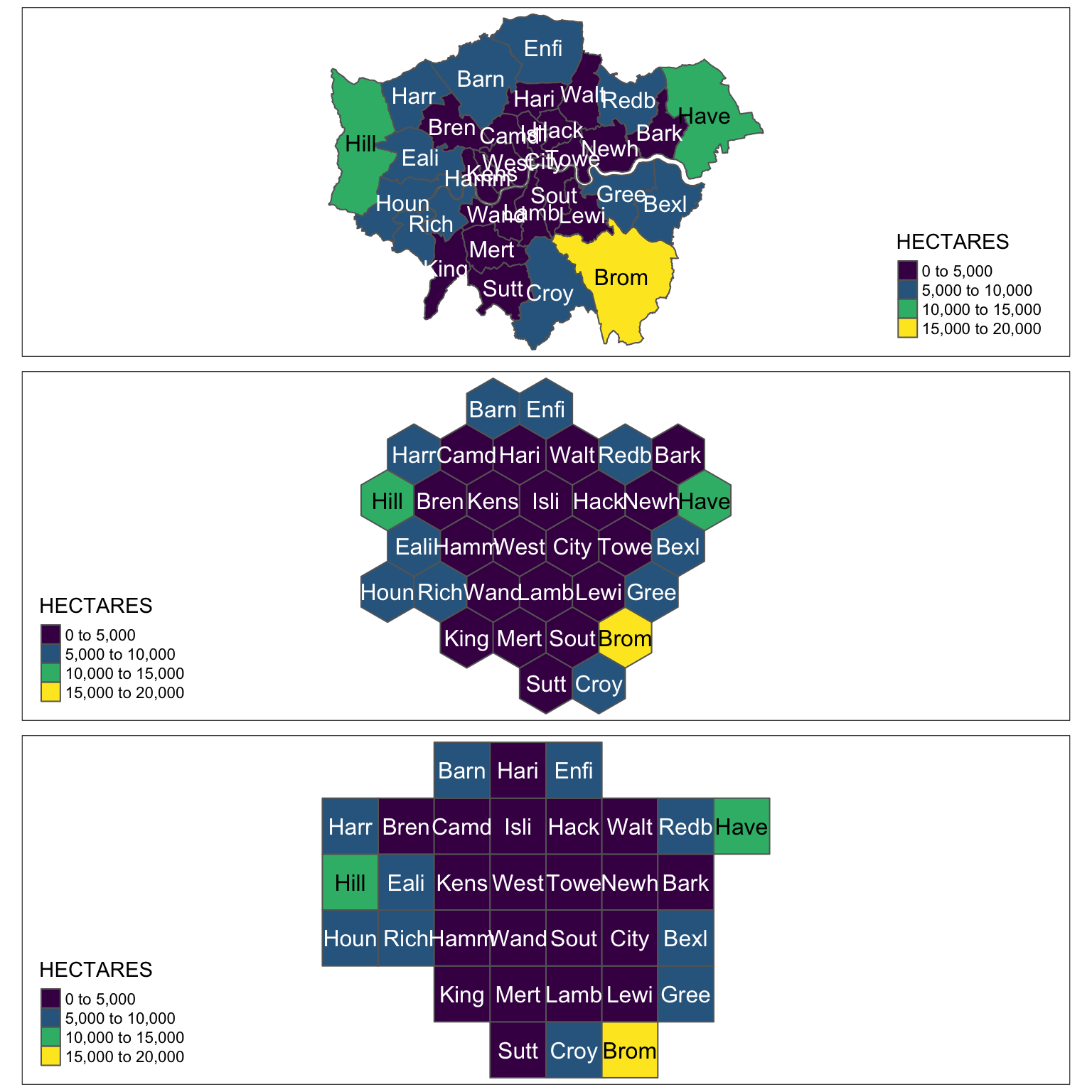 tmap_arrange(rawplot, hexplot, regplot, nrow = 3)
