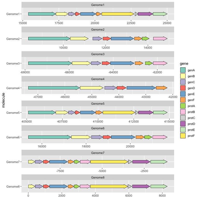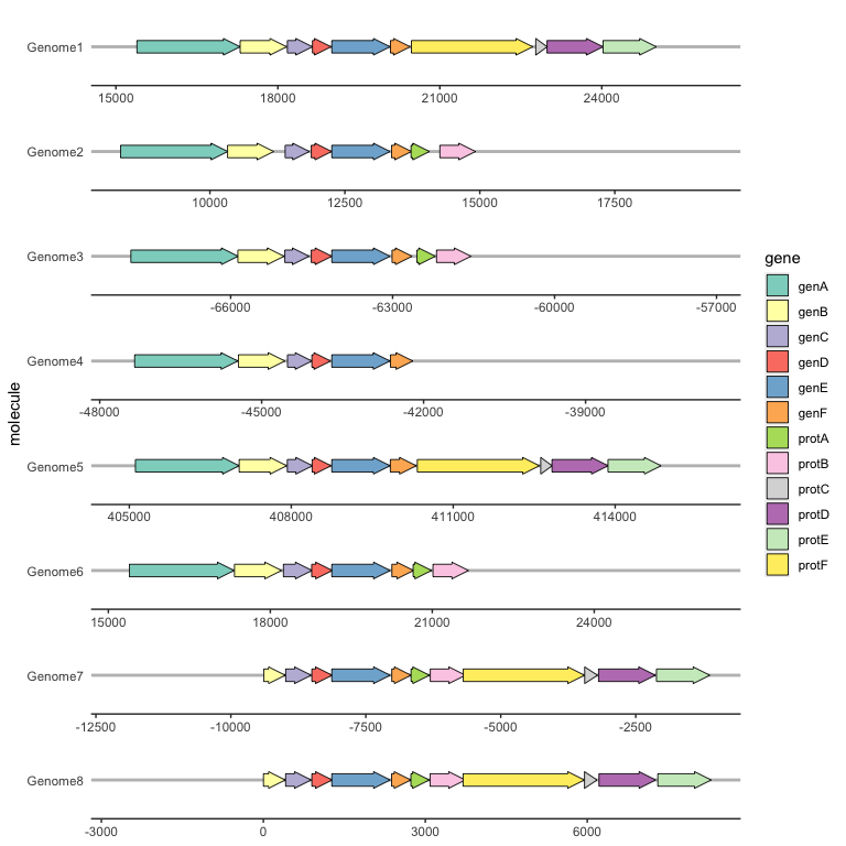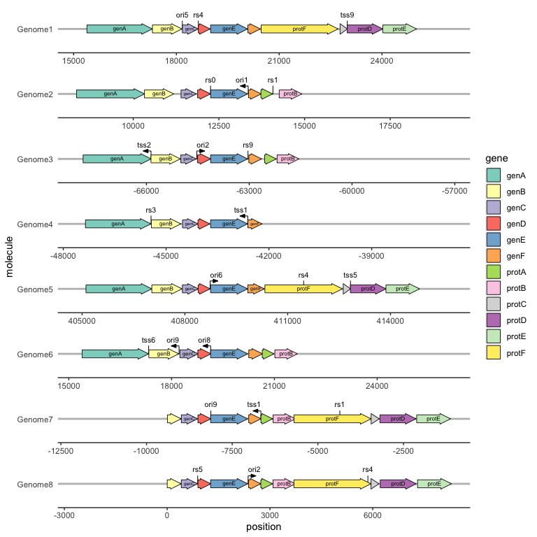 aes(xmin = start, xmax = end, y = molecule, fill = gene, label = gene)