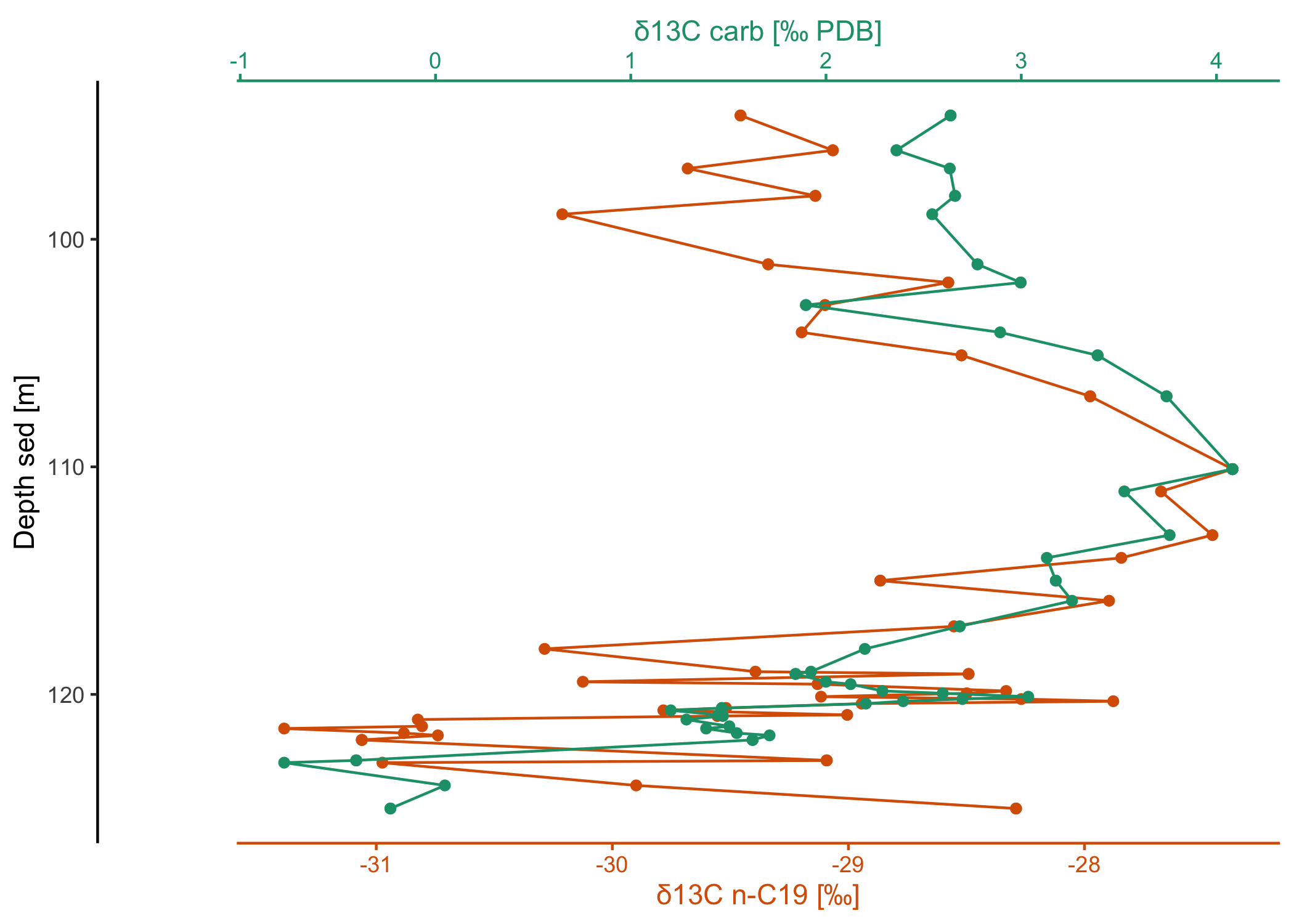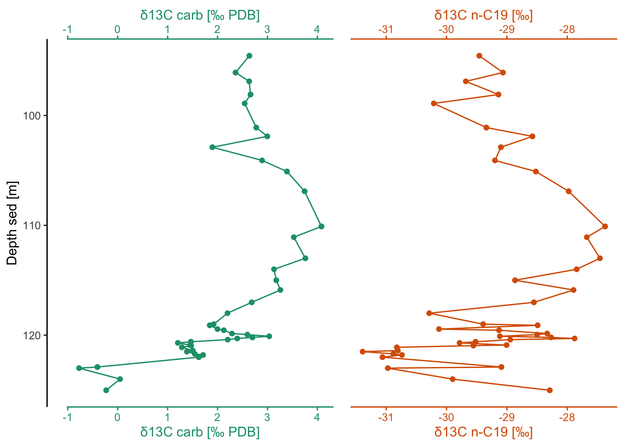 head() |> knitr::kable()| Depth sed [m] | Comp | δ13C [‰ PDB] (mean, vs. VPDB) |