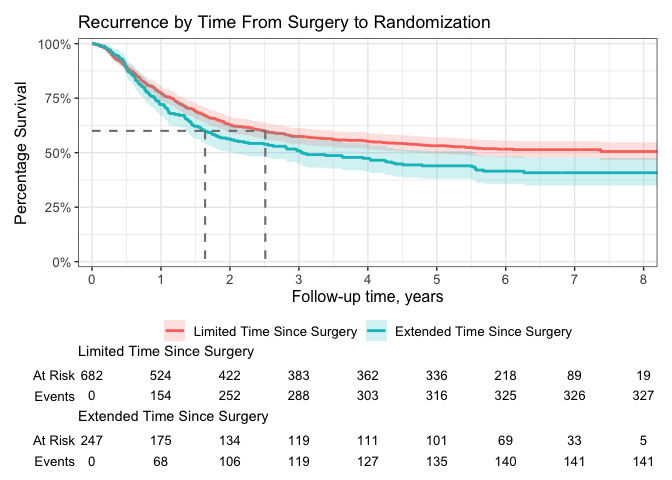 p <- survfit2(Surv(time, status) ~ surg, data = df_colon) |>