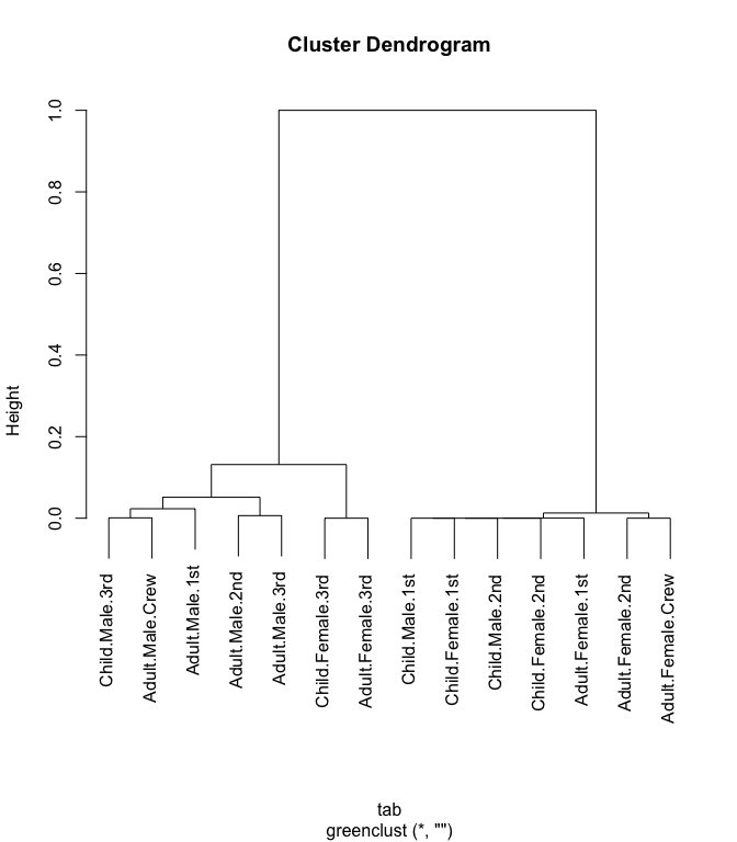 The greenclust() function works like hclust(), only it accepts a contingency table rather than a dissimilarity matrix. For the purposes of this example, we’ll merge the categorical features of the Titanic data set into a single, monolithic category.