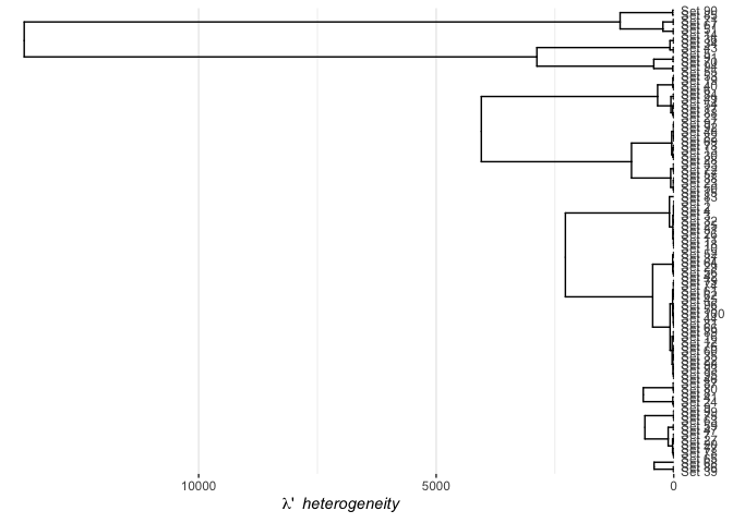 It seems our four sets again draws attention to themselves by having strong connections to a range of other sets distant in terms of the clustering. Also it is obvious that there is two seperate groups of sets in terms of their deviation profile. There might be a secondary structure hidden within the outlying elements. Lets create a hierarchical set clustering based only on the outlying elements:
