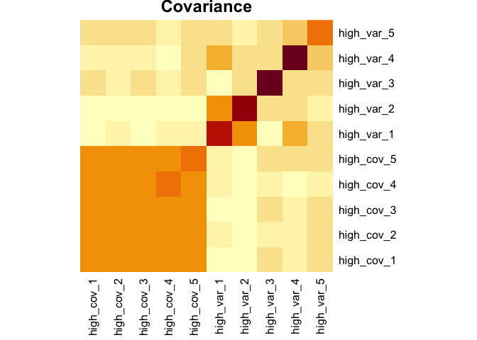 heatmap(Rowv = NA, Colv = NA, symm = TRUE, margins = c(6,6), main = "Covariance")