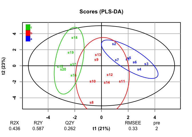 plsda <- opls(select(df2, -factor), df2$factor, predI = 2, permI = 10, fig.pdfC = "none", info.txtC = "none")