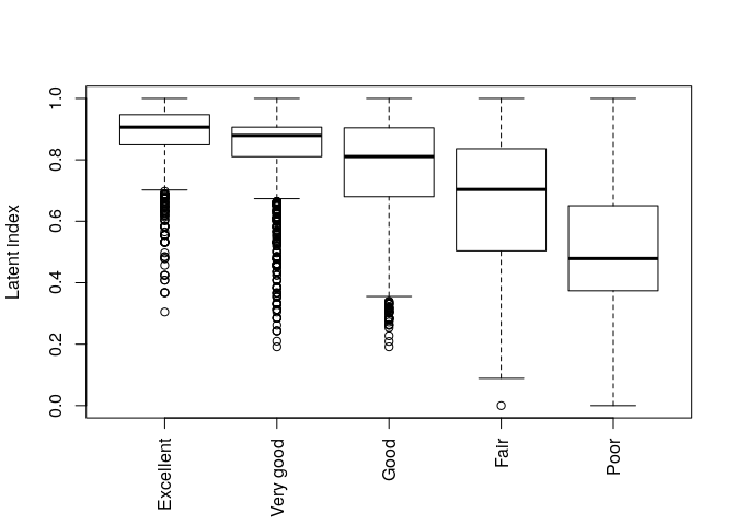The main aim of the reporting heterogeneity analyses is to determine the cut-points used to calculate the adjusted health status for each individual. The calculation of cut-points is realized using the getCutPoints function.