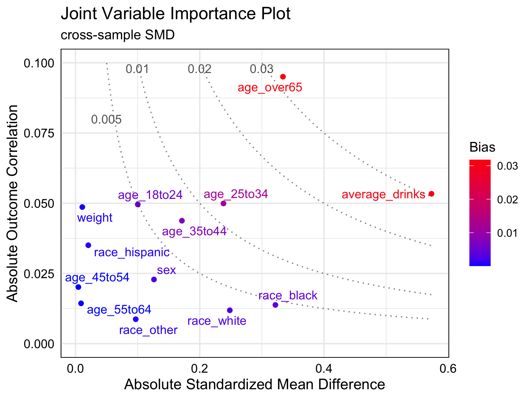 In this example, age_over65 and average_drinks are two most important variables to adjust. At a bias tolerance of 0.01, 3 variables: age_over65, average_drinks, and age_25to34 are above the tolerance threshold. Moreover, age_over65 and average_drinks are of higher importance for adjustment than age_25to34. Although race_black and age_over65 have similar absolute standardized mean differences (0.322 and 0.333, respectively), age_over65 is more important to adjust for since its highly correlated with the outcome.
