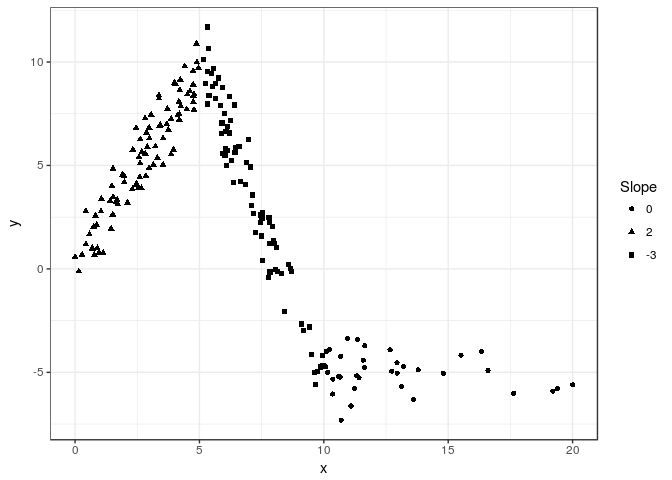 Examples of using lspline(), qlspline(), and elspline(). We will use the following artificial data with knots at x=5 and x=10