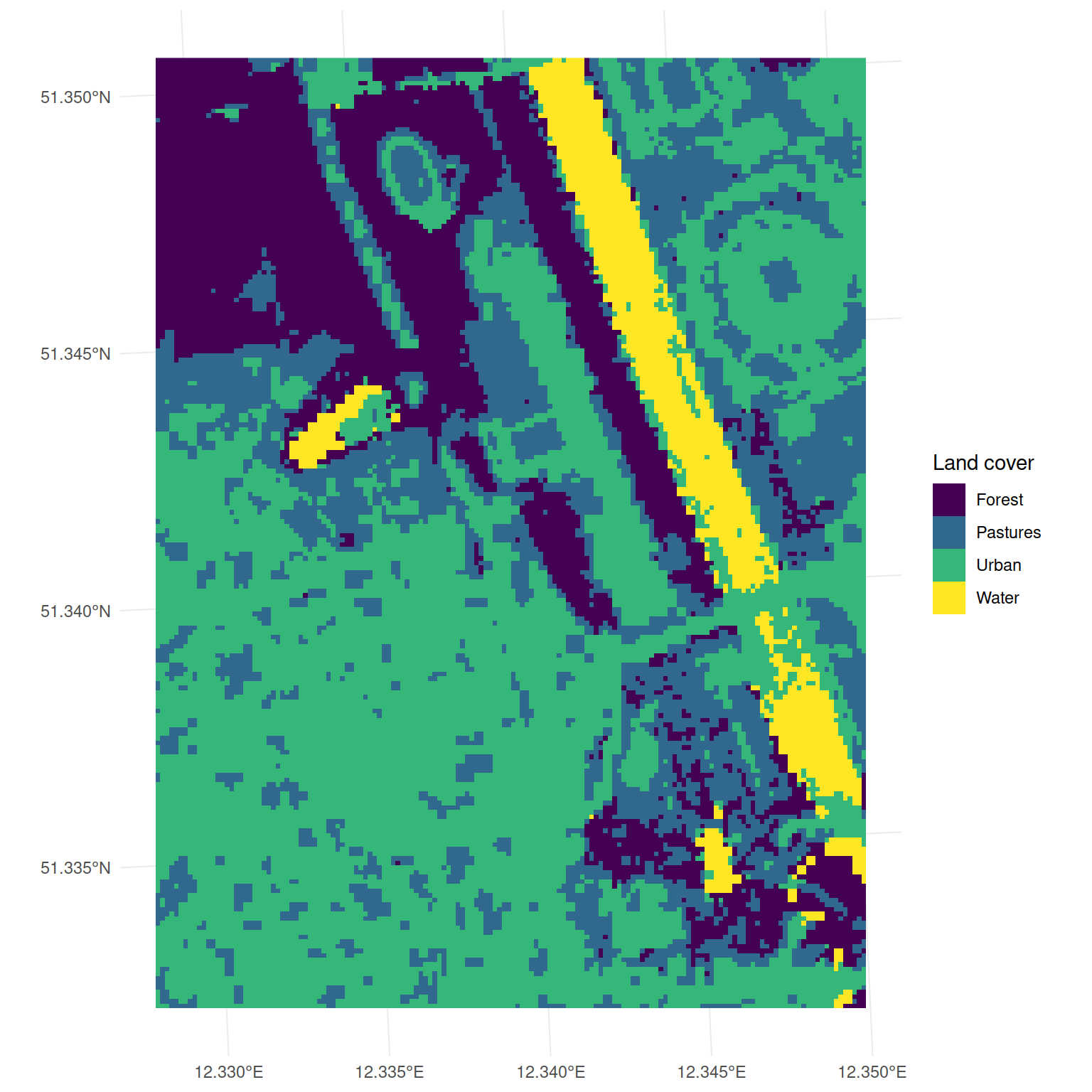 land_cover = predict_spatial(leipzig_raster, learner)## Warning in warn_deprecated("DataBackend$data_formats"): DataBackend$data_formats is deprecated and