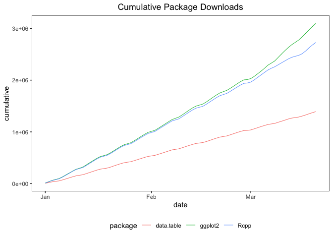 The “spell check” or validation of packages described above, requires some additional background downloads. While those data are cached via the ‘meomoise’ package, this will add time the first time cranDownloads() is run. For faster results, you can bypass those features by setting pro.mode = TRUE. The downside is that you’ll see zero downloads for packages on dates before they’re published on CRAN and zero downloads for mis-spelled/non-existent packages. You’ll also won’t be able to use the to = argument by itself.