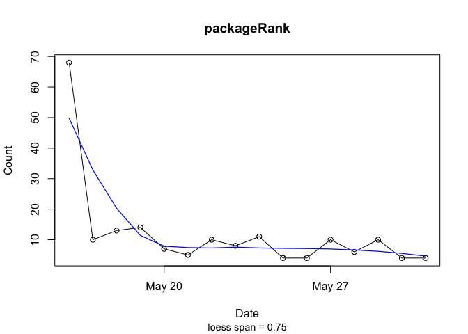 To avoid the bottleneck of downloading multiple log files, packageRank() is currently limited to individual calendar dates. To reduce the bottleneck of re-downloading logs, which can approach 100 MB, ‘packageRank’ makes use of memoization via the ‘memoise’ package.