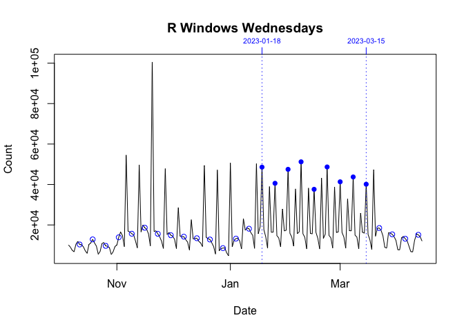 R Windows Sunday and Wednesday download spikes (06 Nov 2022 - 19 March 2023)