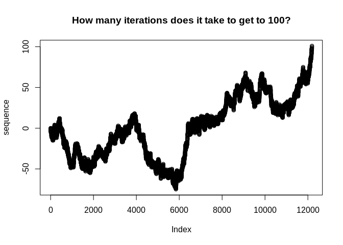 plot(sequence, main = "How many iterations does it take to get to 100?")