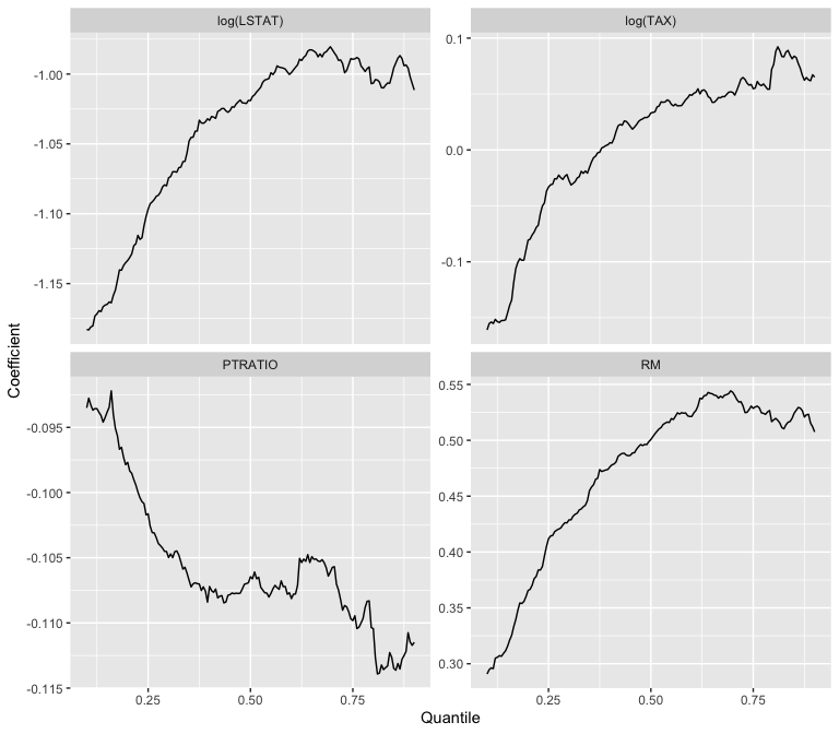 data2 <- data.frame(c(t(beta_hat)), rep(tau, p), rep(c('RM', 'log(TAX)', 'PTRATIO', 'log(LSTAT)'), each = length(tau)))