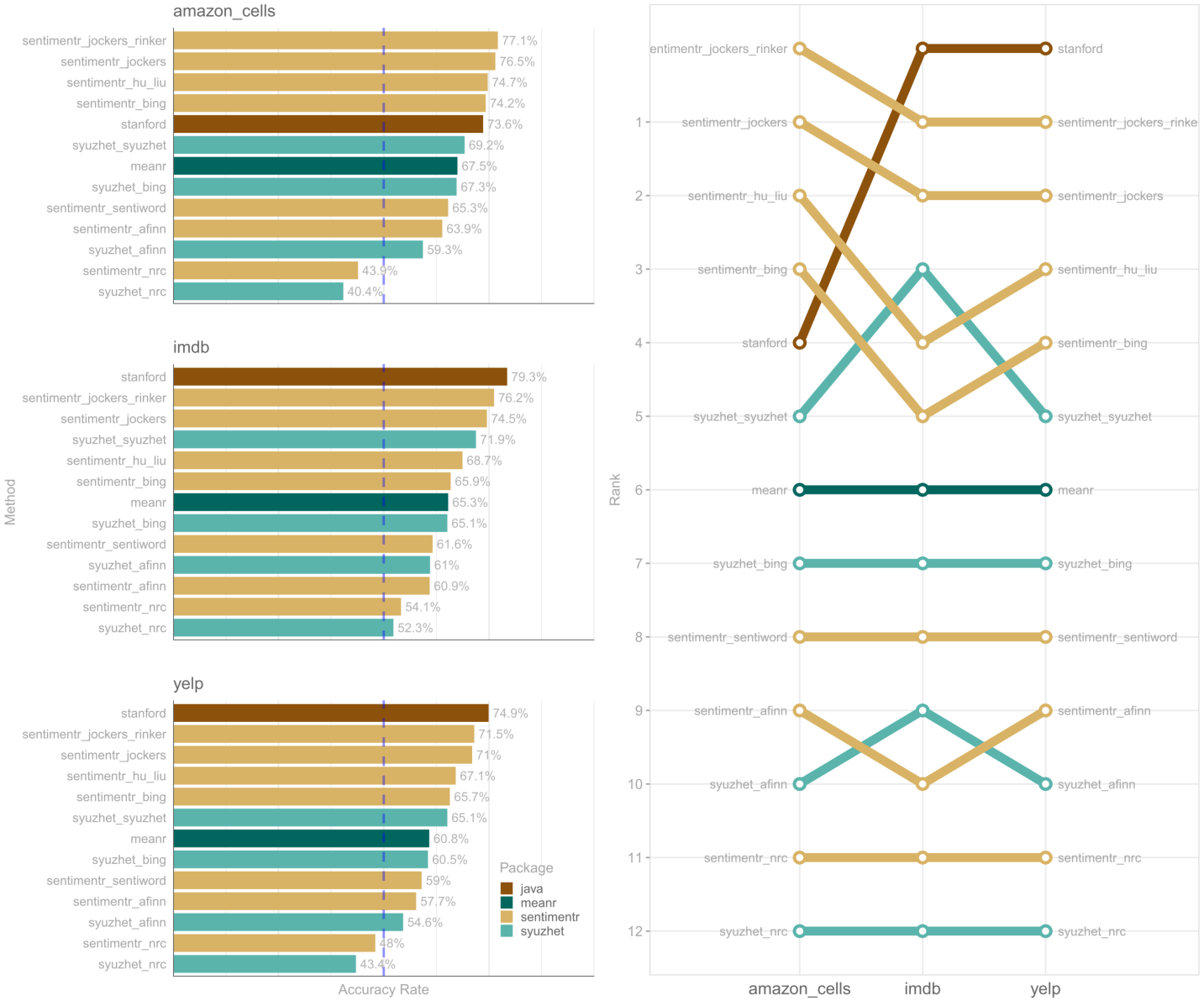 The bar graph on the left shows the accuracy rates for the various sentiment set-ups in the three review contexts. The rank plot on the right shows how the rankings for the methods varied across the three review contexts.