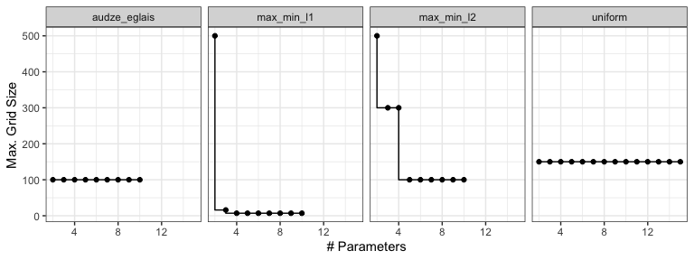 The available designs in this package are for experiments where the number of parameters ranges from two to 15 of types "audze_eglais", "max_min_l1", "max_min_l2", "max_min_l1“, and "uniform".