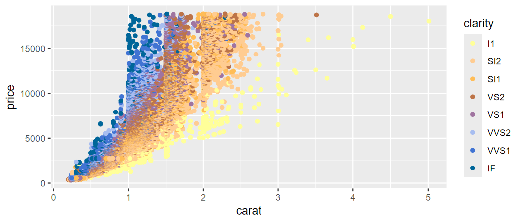 p <- ggplot(diamonds, aes(carat, price, color = clarity)) +