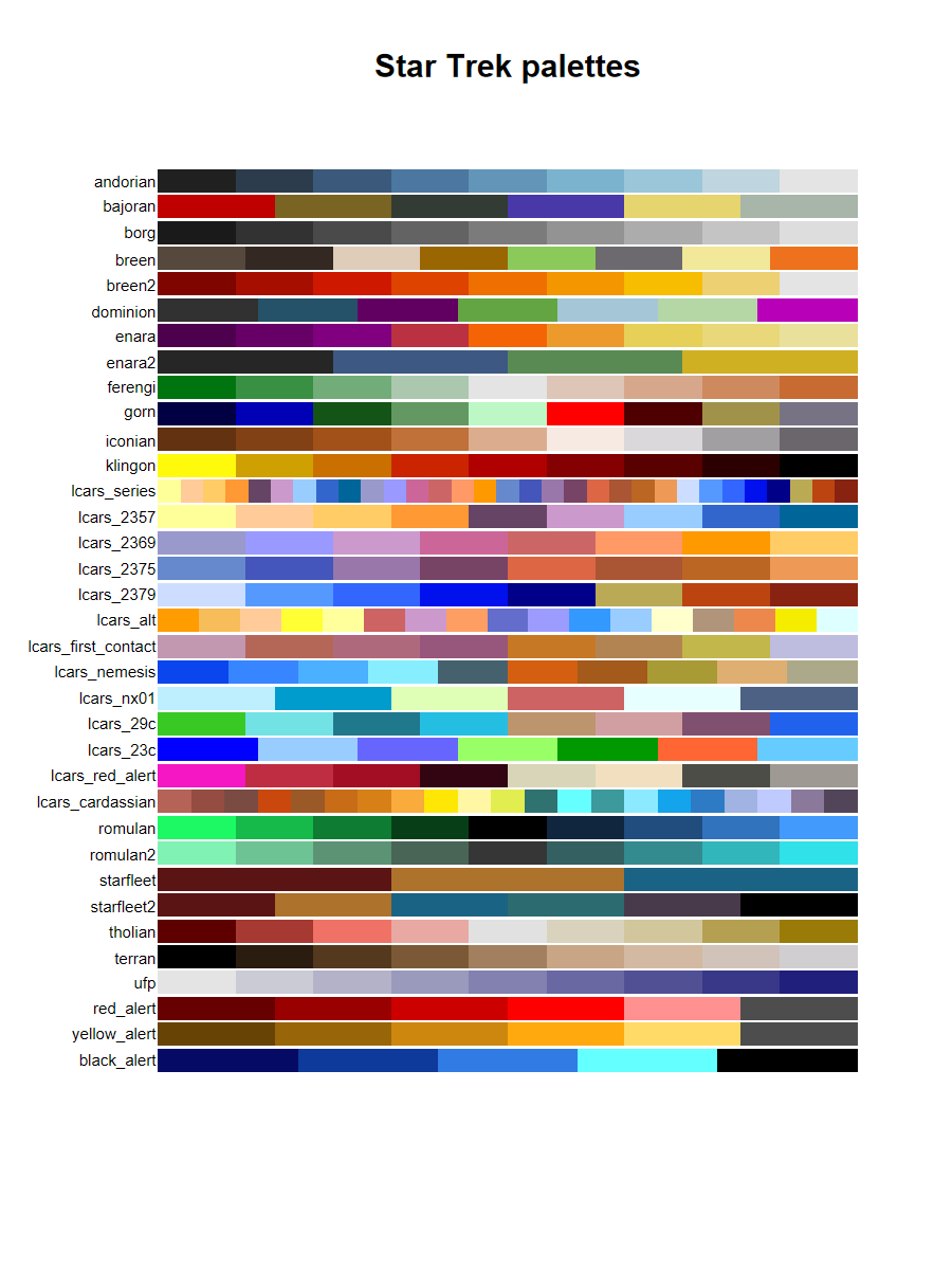 The trekcolors package provides a collection of color palettes based on Star Trek. It also offers functions for custom palettes and scale_* functions for use with ggplot2.