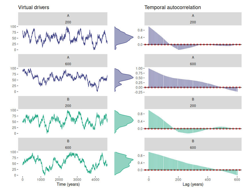 1. Generate virtual drivers with simulateDriverS(). The function allows defining the names of the drivers, a random seed, a time vector, the length of the autocorrelation structure of the driver, and the data range. Note that the final length of the temporal autocorrelation is only approximate, and that time runs from left to right, meaning that older samples have lower time values.