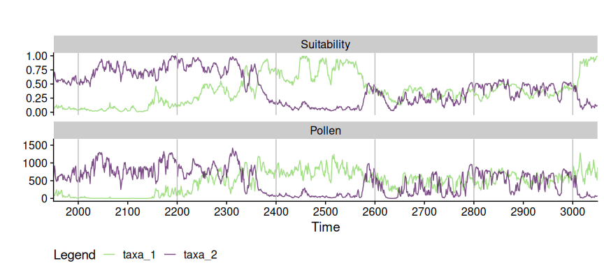 The package virtualPollen simulates pollen curves over millennial time-scales. Pollen curves are generated by virtual taxa with different life traits (life-span, fecundity, growth-rate) and niche features (niche position and breadth) as a response to virtual environmental drivers with a given temporal autocorrelation. It furthers allow to simulate specific data properties of fossil pollen datasets, such as sediment accumulation rate, and depth intervals between consecutive pollen samples. The simulation outcomes are useful to better understand the role of plant traits, niche properties, and climatic variability in defining the shape of pollen curves.
