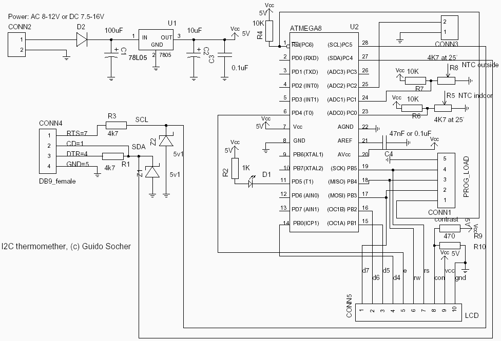 Now we have all we need to build a digital thermometer. We add two NTC sensors, one for inside temperature and one for outside. You can add more if you want (conn3, pin PC2 is e.g free). In the circuit diagram I add already the needed wires for the connection of an LCD display because I don't want you to build a complete new circuit for the next article.