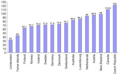 Al igual que con Debian, con los datos de Widi hemos intentado ver la penetración del software libre en los diferentes países tomando como medida la tasa de desarrolladores per cápita. Es importante destacar que mientras en el caso de Debian manejábamos valores absolutos (el número total de desarrolladores Debian nos era conocido), en este caso vamos a tratar con valores relativos. Se puede ver que aún así los países y regiones con mayor número de desarrolladores per cápita sigue siendo prácticamente la misma.