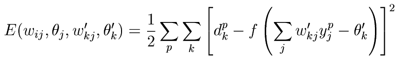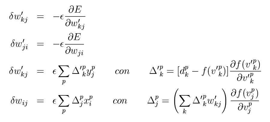 que vemos que es la suma de los errores parciales debido a cada patrón (índice p), resultantes de la diferencia entre la salida deseada dp y la salida que da la red f(.) ante el vector de entrada xk. Si estas salidas son muy diferentes de las salidas deseadas, el error cuadratico medio sera grande. f es la función de activación de las neuronas de la capa de salida e y la salida que proporcionan las neuronas de la ultima capa oculta.Sobre esta función de coste global se aplica algun procedimiento de minimización. En el caso del MLP se hace mediante un descenso por gradiente. Las expresiones que resultan aplicando la regla de la cadena son las siguientes: