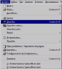 Ya sabemos cómo funciona el sistema de carpetas en GuadaLinex. Como es lógico, la carpeta destinada por defecto a guardar el archivo es la nuestra (usuario aparece en la figura porque este es el nombre con el que hemos entrado en el sistema), pero podemos indicar otra subcarpeta de esta haciendo doble click sobre ella, crear una nueva con , subir un nivel utilizando el botón o intentar alojar el fichero en otra cualquiera (siempre que tengamos permiso de escritura sobre ella, porque ya sabéis que Linux es intransigente con esto de los permisos). Estas opciones se aprecian en la figura anterior o podemos pasear el ratón por la ventana para que los cuadros de ayuda que se abren nos informen. Algo que es mejor no olvidar, obviamente, es el nombre del fichero. Para ello hay que rellenar el campo destinado a ese fin y que aparece como Nombre de Archivo (cuidado con minúsculas y mayúsculas), que podría ser, por ejemplo, PrimerDocumentoWriter. Por último, queremos hacer referencia al menú desplegable Tipo de Archivo porque aquí podemos indicar al programa si queremos guardar este fichero como si fuera un archivo de Writer (extensión .sxw) o, por ejemplo, un archivo de MS Word, con extensión .doc (si trabajamos con este último procesador de textos, esta opción puede sernos de ayuda hasta que tengamos cierta soltura con el Writer). Observemos que también el programa nos permite guardar el archivo con una contraseña, aunque eso lo dejaremos para otro momento. Finalmente, sólo tenemos que hacer click en la opción Guardar.