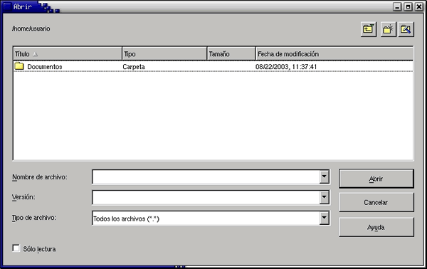 Claro que nuestro propósito no es en absoluto este, así que vamos a volver a abrir este documento (no quiero marear al personal, pero era necesario) y para ello volvemos a entrar en el programa Writer (Aplicaciones->Oficina->Procesador de Textos de OpenOffice.org) y vamos a buscar el documento. ¿Cómo?. Muy sencillo: en la opción del menú Archivo?Abrir, con la que nos aparece una ventana como la que aquí tenemos. Con un poco de suerte tendremos la subcarpeta que creamos para albergar allí nuestro fichero y veremos su nombre (PrimerDocumentoWriter.sxw), seleccionamos el archivo para que aparezca en el menú Nombre de archivo y después hacemos click en Abrir. En otro caso, tendremos que buscar el archivo recordando la ubicación que le dimos. Una vez hecho esto, tendremos nuevamente en pantalla el documento.
