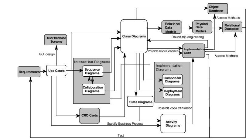 Figura 1: Aproximación a un caso de uso guiado para el desarrollo orientado a objetos con UML, incluyendo las extensiones de tarjetas CRC y extensiones de modelado de datos.