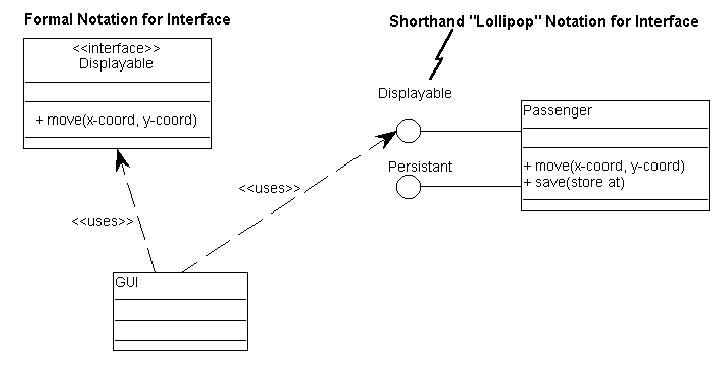 El ejemplo de la Figura 9 muestra que la clase 'Pasajero' ofrece la operación move(x coord, y coord) para su apariencia en un GUI, a través de su interfaz 'Displayable'. Ambas notaciones UML de interfaz, se muestran en la figura. Además, la clase Pasajero también ofrece una opción save(store at) a través de su interfaz Persistente. Una clase de o componente para conectar con una base de datos podría usar esta interfaz.