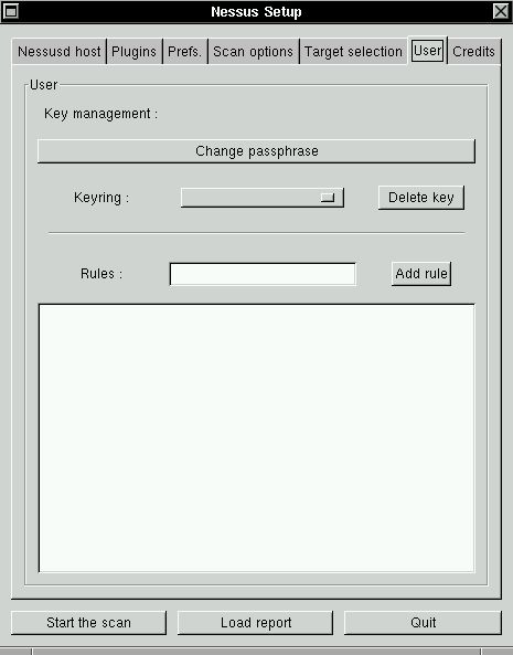 Для запуска nessus, Вам нужно запустить демон сервера, nessusd. Запуская демона в первый раз, Вам надо задать имя пользователя и пароль, используя команду nessus-adduser. Если библиотеки nessus были скомпилированы с ключом "--enable-cipher" (очень рекомендуется, а лучше использовать обязательно!), то сгенерируется персональный ключ. Этот ключ будет защищен с помощью парольной фразы. При запуске сервера доступно большое количество ключей, про все их можно почитать в man-ах по nessusd.