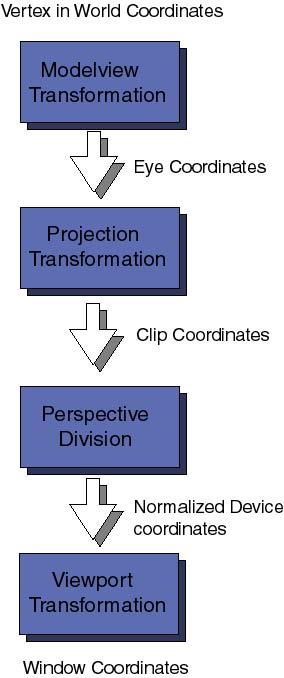 La réponse à la question 2 est simple, il n'y a qu'une solution pour calculer le mouvement, calculer la représentation 3D et réaliser la transformation vers le dispositif de rendu (NDT: "viewport" en anglais) à chaque image. OpenGL! OpenGL est efficace pour ce genre de choses elles sont même parfois réalisées par les cartes graphiques (ceux qui en possèdent verront la différence). Mais avant de voir comment OpenGL répond à ce problème, regardons combien il y a de transformation entre les coordonnées "réelles" du monde 3D et les coordonnées 2D finales sur l'écran.