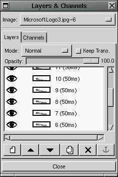 Nadat ik dit helemaal had afgewerkt, had ik 15 frames in totaal. Ik heb de namen van de frames verandert in nummers, door dubbel te klikken op de naam van de laag. Ik heb nog een tip voor je. In de naam van elke laag, kun je tussen haken een tijd aangeven in milliseconden en het Animatie Afspelen filter zal het betreffende frame gedurende die tijd tonen. Op deze manier kun je de afspeelsnelheid van de animatie per frame beheersen. Je hoeft de afspeelsnelheid niet constant te houden, maar je kunt deze wijzigen voor elk frame afzonderlijk. Voor mijn logo voorbeeld gebruikte ik een 50 milliseconde vertraging voor elk frame.