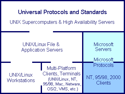 Puesto que tanto NFS como CIFS-SMB son los estándares hoy en día para la interoperatividad de los sistemas de ficheros entre ordenadores, es importante notar que los servidores UNIX/Linux pueden operar con ambos protocolos con rapidez y eficiencia, mientras que los servidores Windows constantemente pierden en las pruebas comparativas y no pueden proveer servicios NFS sin software y licencias adicionales. Usando la aplicación servidor de Código Abierto (libre de coste) llamada SAMBA, una máquina UNIX/Linux puede hacerse pasar por un servidor de ficheros NT, 2000 o XP ante los interfaces de Entorno de Red de los clientes Microsoft. Debido al excelente rendimiento de la entrada/salida de datos en los sistemas operativos UNIX/Linux, el rendimiento de un servidor SAMBA es equivalente al de un servidor Microsoft tanto en velocidad como en fiabilidad. De hecho, las pruebas comparativas publicadas en PC Magazine muestran que el último software de Samba supera en torno al 100% el rendimiento de Windows 2000.