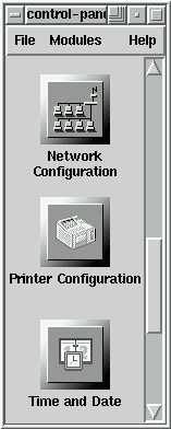 Para iniciar el panel de control, arranque el sistema de ventanas X como root mediante la órden startx y escriba control-panel en una xterm. Es necesario que ingrese como el usuario root para que funcionen las herramientas del panel de control. En el caso que ya esté con X funcionando pero con un usuario normal, puede lograr el mismo efecto si ejecuta la órden su -c control-panel y a continuación deberá ingresar la contraseña de root, cuando el sistema se la pida. Si tiene pensado realizar otras actividades como root, entonces le recomiendo que escriba su -, y luego escriba la contraseña de root cuando le sea solicitada. De esta manera obtendrá un intérprete de órdenes (shell) a nombre de root. Allí, necesitará escribir DISPLAY=:0 control-panel & para hacer que arranque el panel de control. La parte del ``DISPLAY'' le dice al panel de control donde debe mostrarse. Esta sintaxis funciona sólo para los intérpretes de órdenes compatibles con el tipo Bourne, como por ejemplo el ``bash''. Si Ud. utiliza tcsh, deberá usar la órden setenv DISPLAY :0; control-panel &.