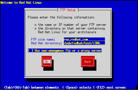 /pub/mirrors/redhat/i386/RedHat, introduzca /pub/mirrors/redhat/i386. Si no está usando FTP anónimo, o si tiene que usar un servidor proxy FTP (si está detrás de un cortafuegos por ejemplo), marque la elección y otro cuadro de diálogo solicitará la cuenta FTP y la información del proxy.