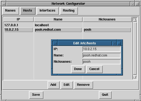 El panel Names de la Network Configuration tool tiene dos propósitos primarios: configurar el nombre y dominio del ordenador, y determinar qué servidores de nombre se usarán para buscar otras máquinas en la red. La Network tool no es capaz de configurar una máquina como servidor de nombres. Para editar o agregar información a un campo, no tienes más que pulsar sobre el campo con el botón izquierdo del ratón y escribir la nueva información.