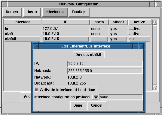 Atención: Ahora hay a tu disposición un botón clone en netcfg. Este botón se puede usar para crear un ``clon'' de una interfaz que ya exista. Usando interfaces clones, es posible que un portátil tenga una interfaz Ethernet definida para la LAN del trabajo, y un dispositivo Ethernet clon definico para la LAN de casa.