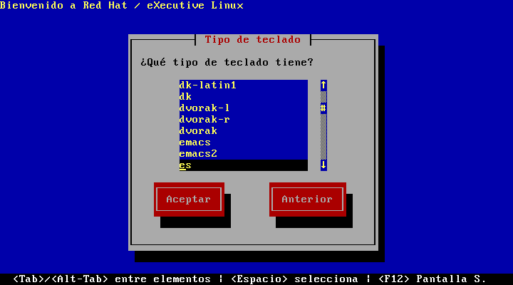 Después de seleccionar el tipo apropiado de teclado, pulse Intro; el tipo de teclado que seleccione se cargará automáticamente tanto para el resto del proceso de instalación como para cada vez que arranque su sistema Red Hat Linux.