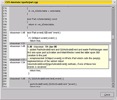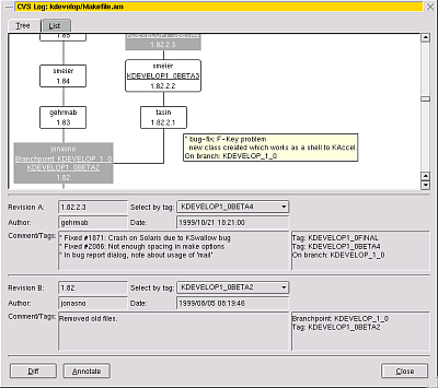 cervisia: Interfaz gráfica KDE para CVS, disponible en http://cervisia.sourceforge.net/ . El pantallazo de su ventana principal,