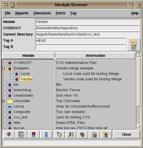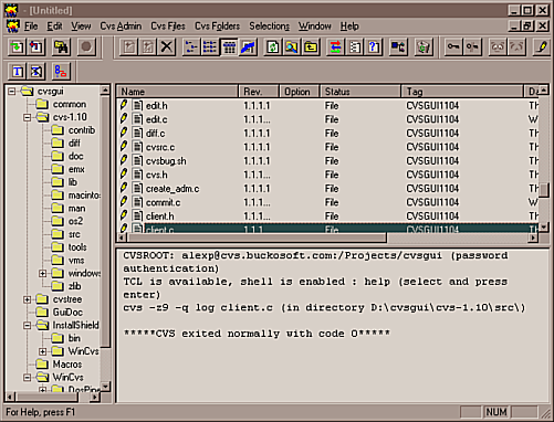 tkcvs: Interfaz gráfica para CVS escrita en Tcl/Tk muy establecida y estable, disponible en http://www.twobarleycorns.net/tkcvs.html. El pantallazo de su ventana principal,