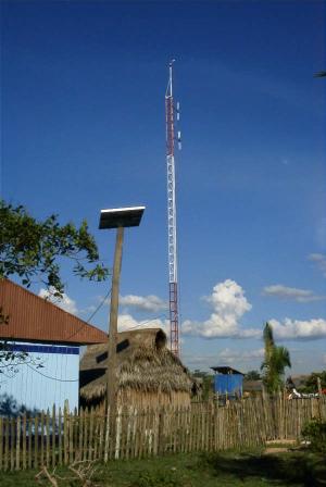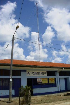 En zonas como Alto Amazonas, con establecimientos separados decenas de kilómetros, sin teléfono, la infraestructura más sencilla y usada para comunicar los puestos de salud con su centro de salud es la radio VHF, ya que su alcance puede ser del orden de 50 Km, limitado por la potencia de transmisión y la altura de las antenas, que deberán compensar la curvatura de la tierra y salvar los obstáculos, aunque tiene bastante tolerancia a los mismos. Se eligen pues en estos casos radios VHF convencionales que se utilizan normalmente para voz, pero que, intermitentemente, pasan a intercambiar datos entre un ordenador cliente en el puesto de salud y un servidor situado en su centro de salud de referencia. Una instalación solar en el puesto de salud alimenta la radio y el ordenador cliente, así como otros aparatos auxiliares (modem radio, luminarias, etc). Los centros de salud disponen de un cargador de baterías para alimentar el servidor las horas necesarias, aunque el grupo electrógeno esté apagado, ya que sólo se enciende a la puesta del sol, durante unas cuatro horas. El servidor a su vez se comunica intermitentemente con internet a través del teléfono o, en algunos casos, a través de un terminal VSAT. En las fotos siguientes se ven las antenas de VHF de un centro de salud y un puesto de salud, éste con su placa solar.