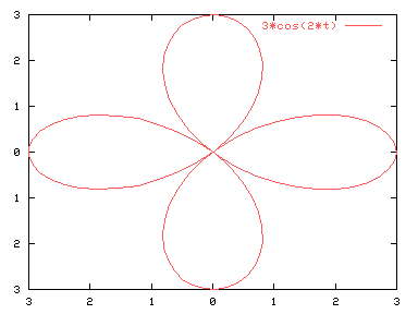 En coordenadas polares la variable t se refiere al ángulo. Se dispone de la opción "set trange [t1:t2]" para indicar el intervalo en el que queremos que se represente nuestra figura. Por defecto se hará entre 0 y 2*pi. El gráfico se representa en un área rectangular; las opciones "set xrange" y "set yrange" modificarán tanto la altura como la anchura. Por ejemplo: